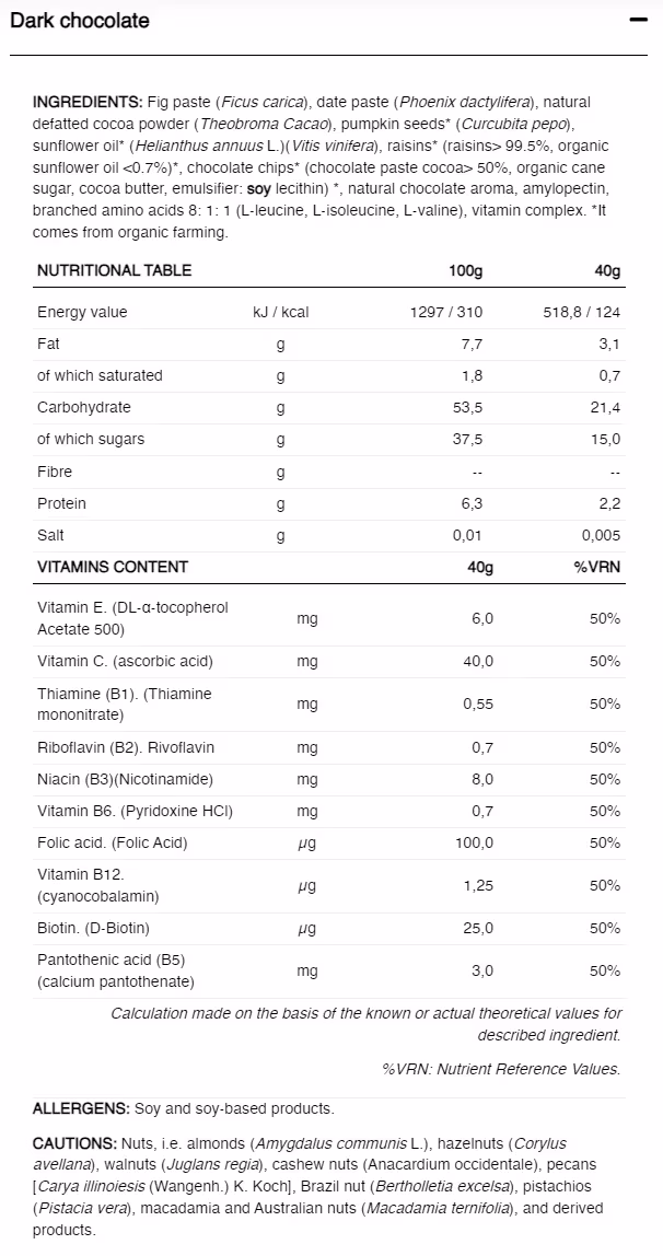 Energibar med høyt karbohydratinnhold, basert på tørket frukt og gresskarkjerner. Passer for veganere.
